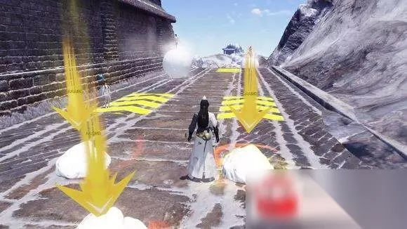 到了第三个加速点,很多人都会纠结走上还是顺着提示黄标走。楼主建议走上面下去,走旁边的话,更难控制