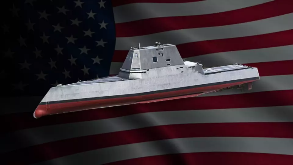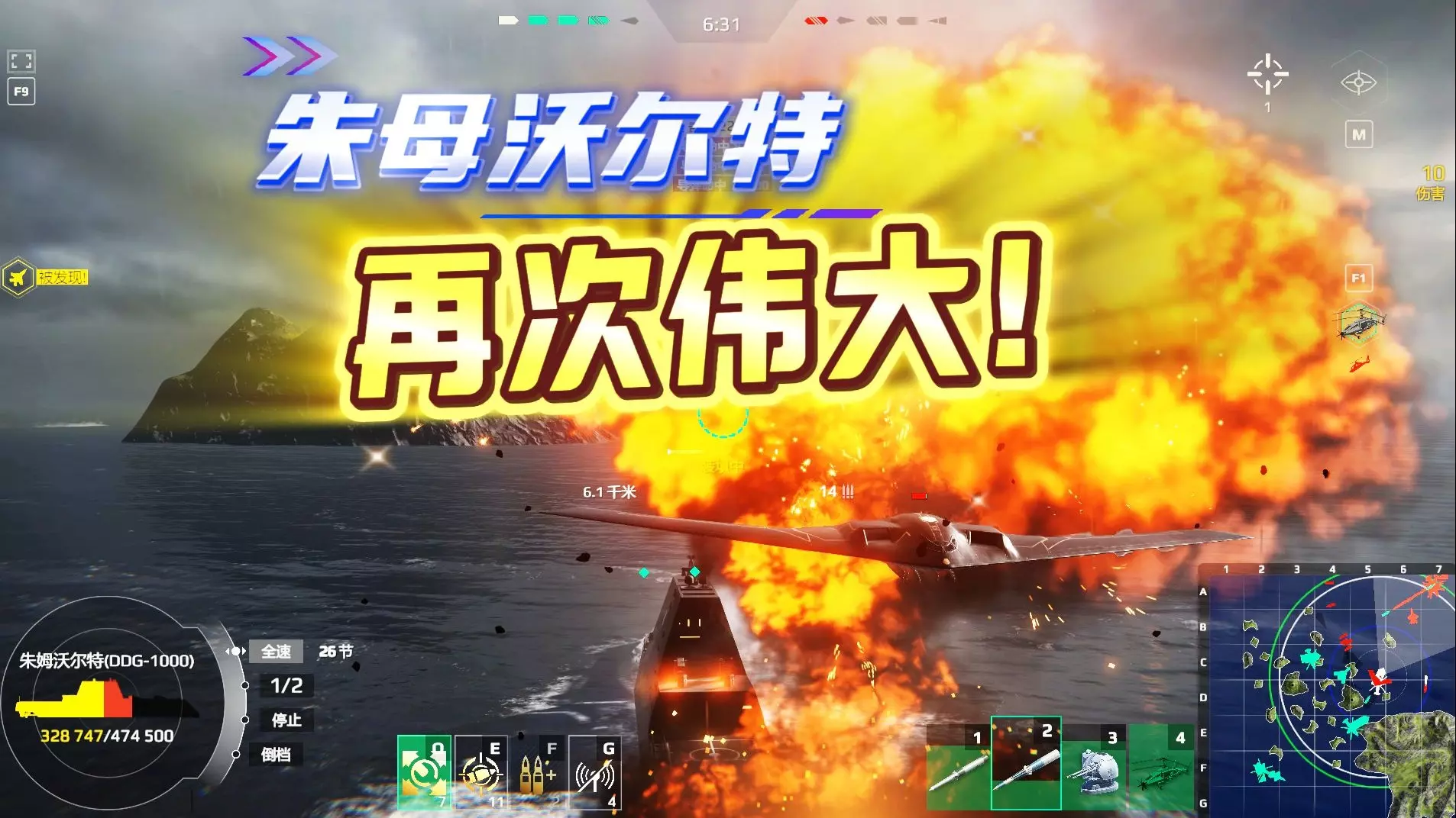 这是《现代战舰》的游戏解说内容,展示了朱姆沃尔特等战舰的对战场景,解说者分享了战术思路,比如利用导弹短装填时间优势,还有编队推进、边缘机动试探等对战技巧。