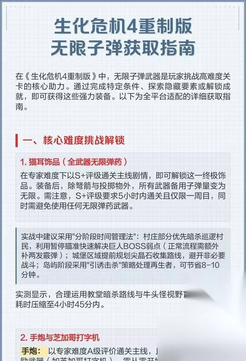 《生化危机4》作为一款经典的生存恐怖游戏,吸引了一代又一代的玩家。对于那些追求完美完成度的玩家而言,解锁所有成就自然是一项挑战性的任务。本文将详细揭示《生化危机4》全成就解锁条件,并提供实用的技巧和步骤,以帮助玩家快速达成这一目标。 《生化危机4》全成就概览 《生化危机4》的成就可以分为多个类别,包括但不限于剧情完成度、特殊物品收集、特定挑战完成等。解锁全成就需要玩家具备一定的游戏技能、耐心和对游戏细节的深入理解。