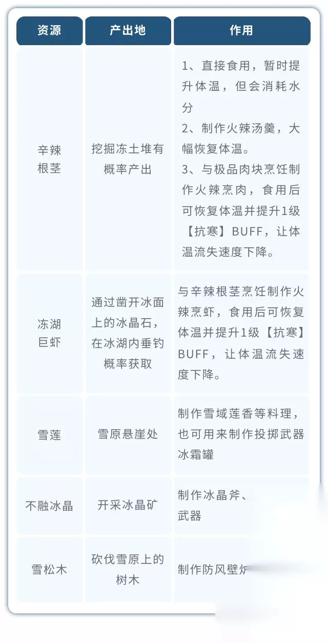 重返大地,你需要直接面对残酷的大自然。没有高科技的帮助,你必须收集身边的材料,用最原始的手段打造求生工具,尽快摆脱风餐露宿茹毛饮血的窘况。接下来就由小编给大家带来了详细的《荒原曙光》北部雪原区域攻略! 《荒原曙光》北部雪原区域攻略: 一、地区特点: 北部雪原主要分为普通雪原区和霜雾之境两个区域,区域内被冰雪覆盖,常年低温,体温会持续下降;在寒冷的环境下,角色饱食度消耗速度也会增加(更容易饿) 二、求生难点 普通雪原:在缺乏保暖措施的情况下,会因为矢温而持续损失生命值,矢温程度会随着时间而加重。 霜雾之境:会快速矢温,矢温程度也会快速上升。冻伤将会极快地扣除角色生命值。 三、求生建议 食物:辛辣根茎、火辣羹汤、火辣烹肉、火辣炖虾 御寒衣物:风雪衣 其他:利用火把、篝火御寒,注意当雪原出现暴风雪时,无法正常生火,建议搭建简易遮雪鹏来生火保暖 注意点:低温区域内燃料的消耗速度会大幅加快,燃料在雪原地区较难获取,取暖后记得熄灭篝火哦! 四、采集&狩猎资源 1、采集