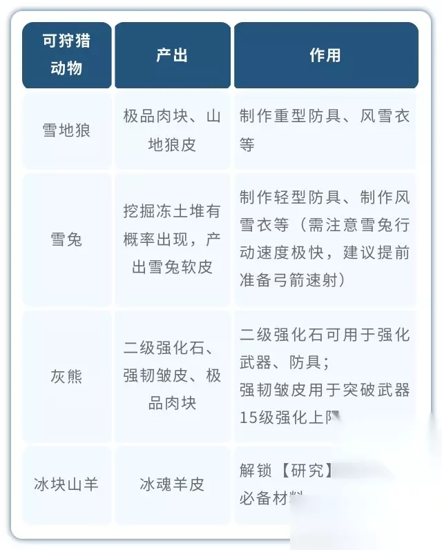 五、推荐挑战挑战 雪原银髦(建议组队前往):弱火属性伤害。击败后可以吸纳【暗夜之影】,在领地成功放置后可以提升冰霜属性伤害。掉落的银色鬃毛为突破强化的必须材料。