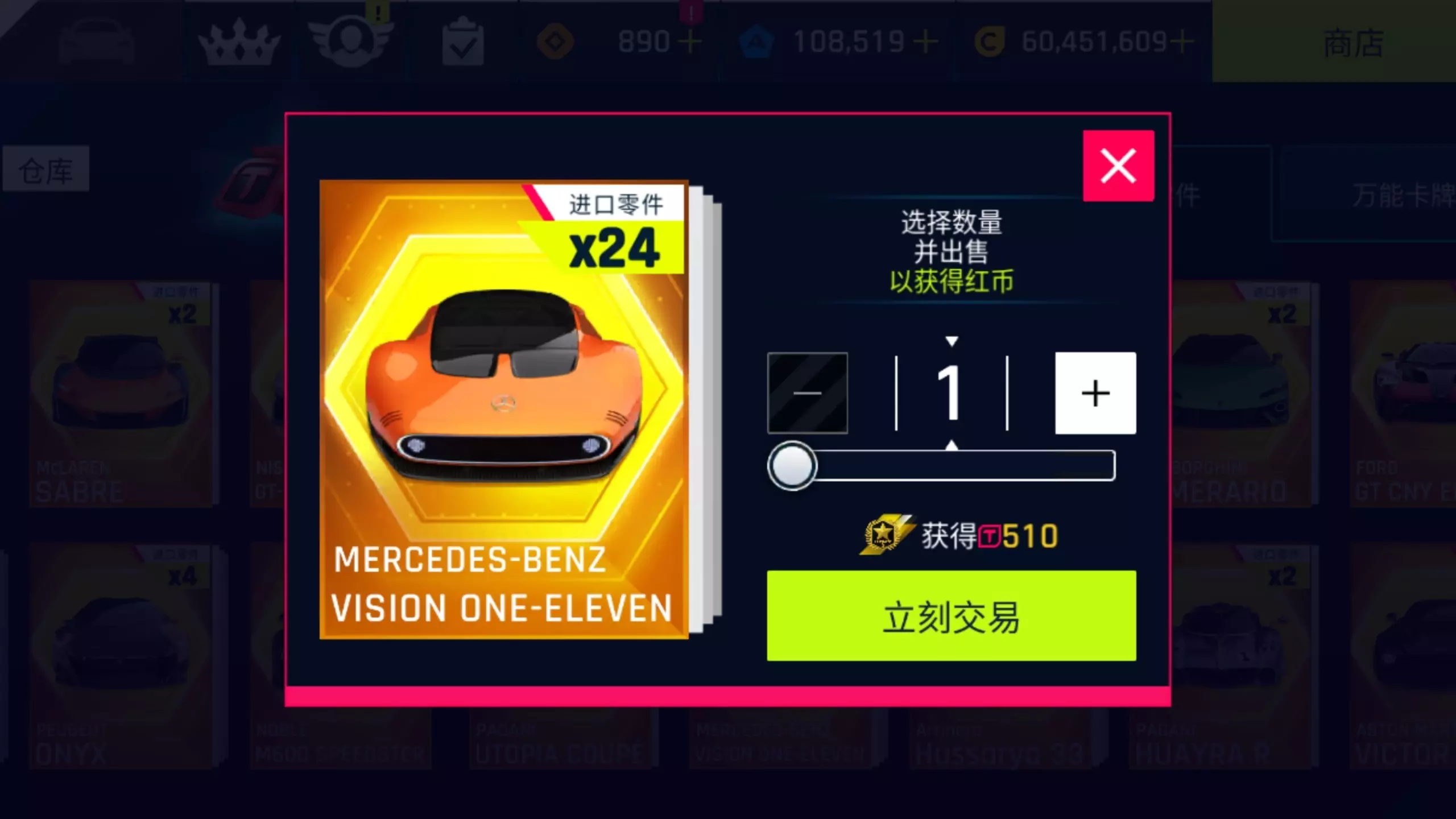 这是《狂野飙车》的游戏抽奖相关帖子,展示了抽到的A车梅赛德斯-奔驰VISION ONE-ELEVEN的升级过程,包括使用金卡、进口零件提升车辆性能分,还完成了连环目标、寻宝任务等升级相关任务,升级一次金卡花费76万金币。