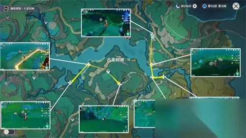 与箭头指向的【古老的石碑】对话后,按照提示随便丢下去三块肉,即可召唤龟龟。然后跳到龟背上抚摸龟龟的头,等待龟龟移动至终点后,即可常驻于此。 需要跟随世界任务【沉玉祝珑】即可进入洞内。 2、古茶树坡15个