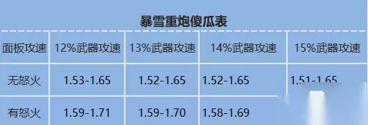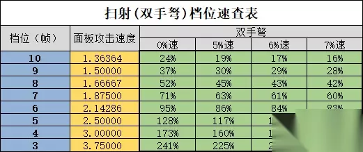 不同档位的扫射命中时触发四件套的频率也不一样。默认打桩的情况下: 10帧时每隔10帧触发一次。 9帧、3帧时每隔9帧触发一次。 6帧、4帧时每隔12帧触发一次。 8帧时每隔16帧触发一次。 7帧时每隔14帧触发一次。 从频率而言不难看出来最差的档位是8帧,其次是7帧。9帧突破到8帧输出会降低,5帧突破到4帧输出也会降低。 4、考虑到我们速刷要吃加速塔,所以一般情况下我们要做到无怒火常态9帧吃加速进7帧,有怒火特效(+75%攻速)常态5帧吃加速不进4帧。 所以可以得出下面这张表格