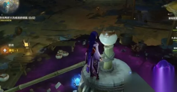 《原神》两把火药库房的钥匙位置 一、第一把钥匙 1、来到如下图所示的紫色池子位置,飞到最顶端的位置;