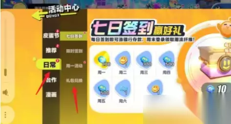 2、然后需要依次点击左侧的【日常】-【礼包兑换】功能。