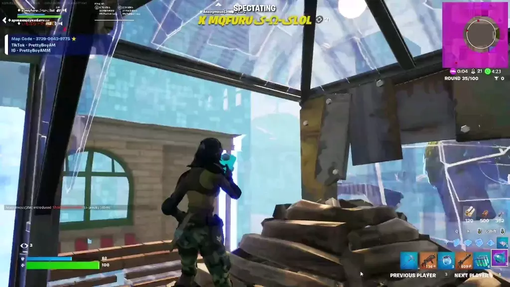 玩家分享《堡垒之夜》大逃杀模式的游戏经历,在和老外队友组队游玩时,遇到了让队友都看懵的游戏bug,展示了在斜塔小镇等地的对战、探索画面。