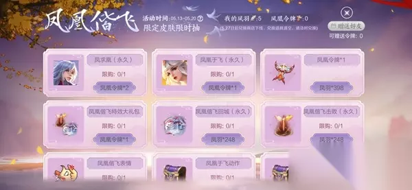 活动可以累积获得羽毛来兑换皮肤,也有可能一次性抽中了凤凰令直接兑换皮肤。