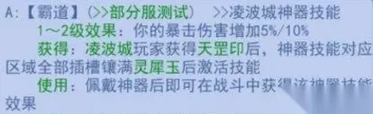 2、霸道 1-2级效果:你的暴击伤害增加5%/10% 获得:凌波城玩家获得天罡印后,神器技能对应区域全部插槽镶满灵犀玉后激活技能 使用:佩戴神器后即可在战斗中获得该神器技能效果 消耗:PVE每场战斗消耗1点神器灵气,PVP每回合消耗1点