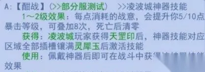 3、酣战 1-2级效果:每点消耗的战意,会提升你5/10点暴击等级,可叠加8次,死亡后清零 获得:凌波城玩家获得天罡印后,神器技能对应区域全部插槽镶满灵犀玉后激活技能 使用:佩戴神器后即可在战斗中获得该神器技能效果 消耗:PVE每场战斗消耗1点神器灵气,PVP每回合消耗1点