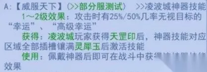 梦幻西游,凌波城新神器上线了,神器除了一些属性的增加外,每个神器还有3个神器技能,相信很多玩家都很想知道凌波城的神器技能是什么,下面就跟小编一起来看看梦幻西游凌波城神器技能介绍吧! 梦幻西游十五门派新神器技能盘点 大唐官府 方寸山 化生寺 神木林 女儿村 天宫 五庄观 普陀山 凌波城 龙宫 阴曹地府 无底洞 盘丝洞 魔王寨 狮驼岭 凌波城天罡印神器技能: 1、威服天下 1-2级效果:攻击时有25%/50%几率无视目标的“幸运”、“高级幸运” 获得:凌波城玩家获得天罡印后,神器技能对应区域全部插槽镶满灵犀玉后激活技能 使用:佩戴神器后即可在战斗中获得该神器技能效果 消耗:PVE每场战斗消耗1点神器灵气,PVP每回合消耗1点