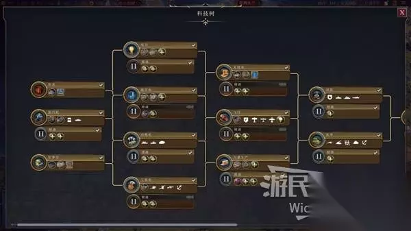 科技与市政是两个不同的系统,点击最左侧的基础科技或市政即可进入研发状态,研发一个科技或市政需要数个回合,而研发回合数看的是左上角的科技值与文化值,这两个数值下面会介绍。 研发科技与市政可以解锁新的建筑与单位,也是发展最重要的步骤,科技与市政的研发可以同时进行,但一次只能研发一个科技与市政。