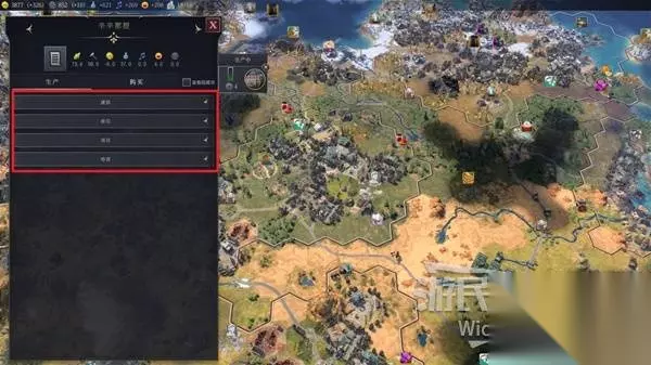 点击城市可以看到城市的各项基础数值,这些数值的用处将在后续继续介绍,这里我们需要关注数值下方的【生产】与【购买】操作。 这两种操作是发展城市的基础,点击生产后可以看到有【建筑】、【单位】、【项目】、【奇观】四种可选操作,生产所需的回合时间根据此城市的生产力计算。 如首都完成一个建筑需要100生产力,而首都的生产力数值为20,那么首都完成这个建筑所需的回合数为5回合,其他所有生产都是这样计算。 右侧的购买选项则是直接用金钱直接购买我们需要数回合才能生成出的完成品,下面将依次介绍城市生产的四种操作。