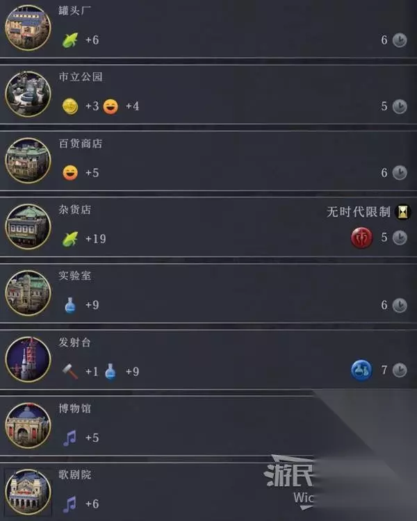 【建筑】直接建造在城市范围内所有可选格子的设施,可以为城市本身提供生产力、科技与文化数值。