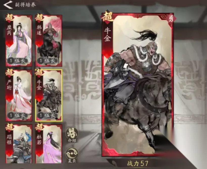 4、牛金牛金的天赋能让主将的普攻伤害提升11%,并且获得11%的攻心,韬略是带来1.5%物理攻击加成,并提升1.5%兵力,牛金的普攻增益辅助,比较适配曹仁能极大提升他在进攻端的作用。