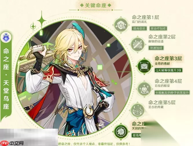 五、命之座效果解析 卡维的命座均有实际用途,其中3命可进一步提升草原核造成的伤害上限,6命则使其摆脱对妮露的依赖,独立构建绽放体系。最关键的核心命座为第2、第4和第6命,显著增强其功能性与输出循环效率。