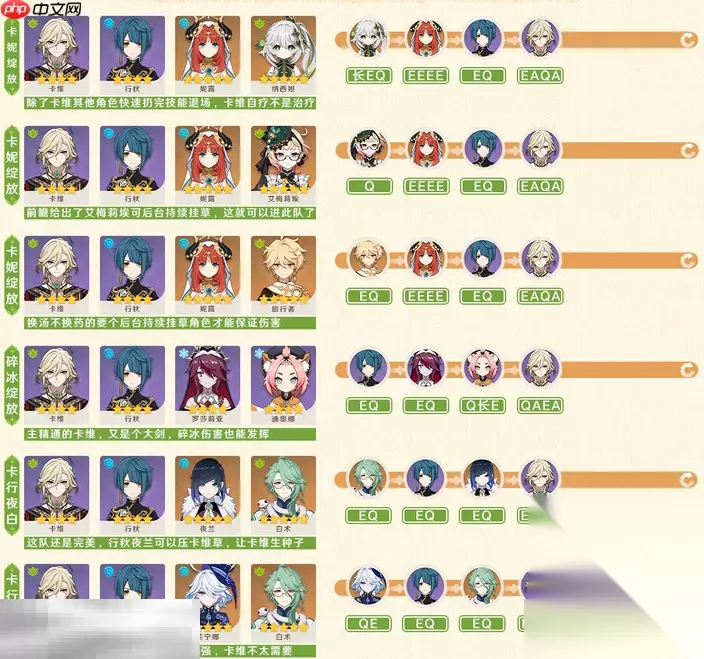 六、阵容搭配推荐 卡维主打绽放反应体系,在当前版本中可参与多种配队组合,包括经典的卡妮绽放队、结合碎冰机制的碎冰绽放队,以及以行秋、夜兰、白术为核心的卡行夜白队和卡行芙白队,灵活适配不同玩家的box配置。