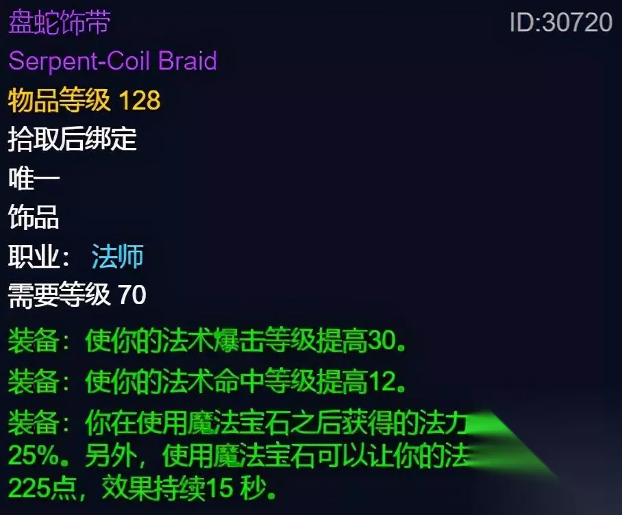 魔兽世界tbc盘蛇饰带属性是怎么样的?在魔兽世界中,除了武器之外,饰品的属性也是很重要的,其中就包含有盘蛇饰带这个首饰了,下面小编为大家带来的就是盘蛇饰带的属性介绍了,我们就一起来看看吧。 魔兽世界tbc盘蛇饰带属性一览 “盘蛇饰带”,这件装备只有法师职业可以获得使用,给到的属性非常全面,暴击等级提升了30点,命中等级提升12点。