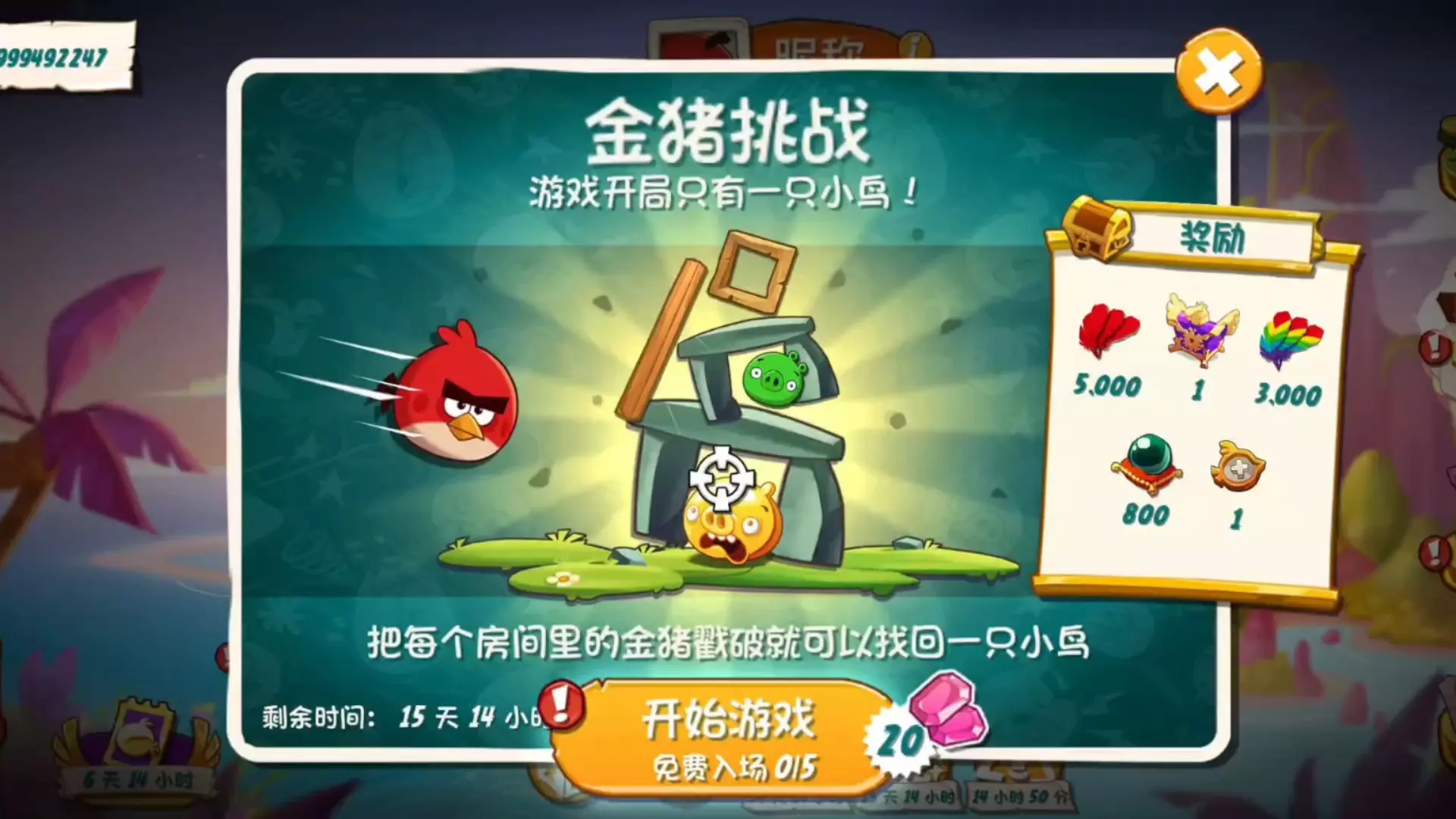 这是《愤怒的小鸟2》的金猪挑战209关卡内容,该挑战开局仅1只小鸟,戳破房间里的金猪可找回小鸟,完成挑战能获得羽毛、宝石等丰厚奖励,图中展示了关卡的战斗场景。