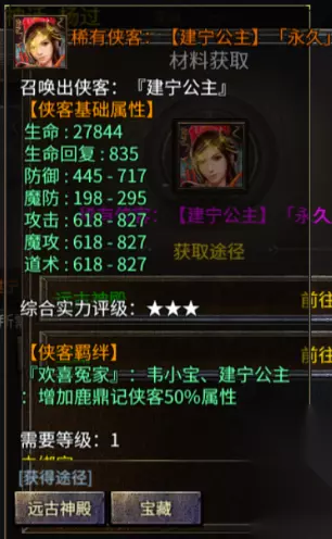 建宁公主:稀有侠客 综合实力:三星 羁绊:韦小宝 获得途径:魔道试炼·远古神殿(3转)