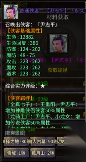 尹志平:普通级侠客 综合实力:一星 羁绊:王重阳、小龙女、韦小宝、王语嫣、林平之 获得途径:抉择之地(80级),兽人古墓(90级),火龙洞(100级),雪域(1转),