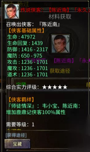 陈近南:传说级侠客 综合实力:五星羁绊:韦小宝