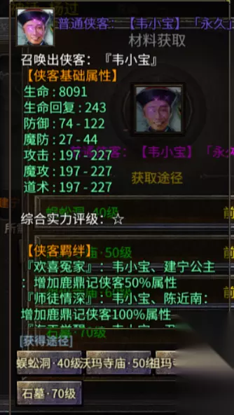 t15_2-t15_1:4.0 侠客根据游戏中的稀有度,会分为普通(紫色),稀有(橙色),传说(红色),神话(金色)四个级别,在图鉴系统中,会按照该侠客的出自哪一部作品来进行分类。 【鹿鼎记】 韦小宝:普通级侠客 综合实力:半星 羁绊:建宁公主、陈近南、尹志平、王语嫣 获得途径:50级主线任务,蜈蚣洞(40级),沃玛寺庙(50级),祖玛寺庙(60级),石墓(70级)