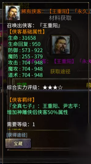 【神雕侠侣】 王重阳:稀有级侠客 综合实力:三星半羁绊:尹志平