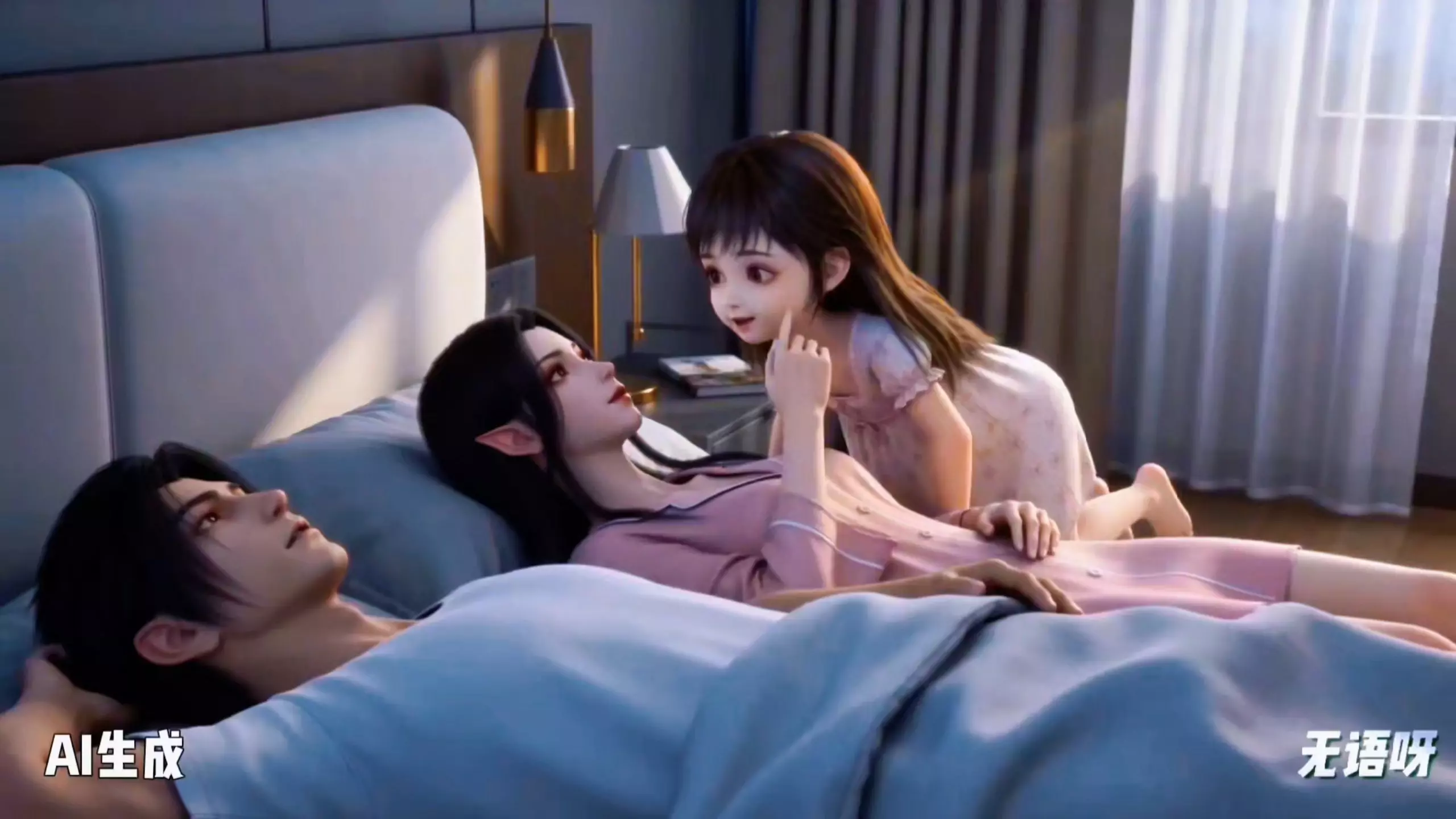这组AI生成的图文展示了萧潇与另一小女孩的互动,萧潇说着“叫小姨就换个样子跟你玩”,随后变换造型,画面还有其他角色登场,呈现出趣味十足的仙侠风格互动场景。