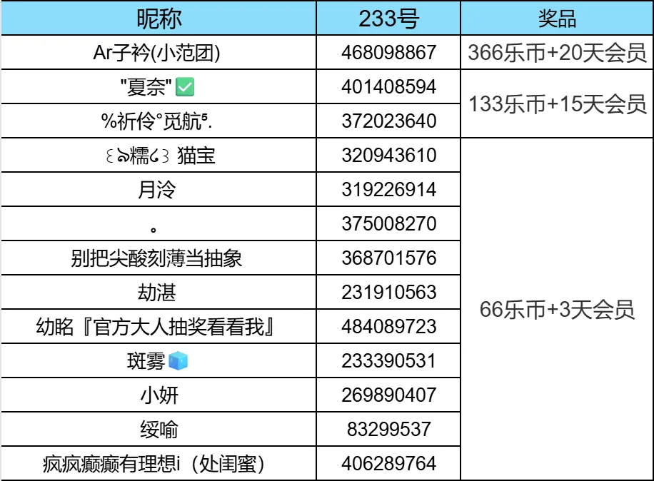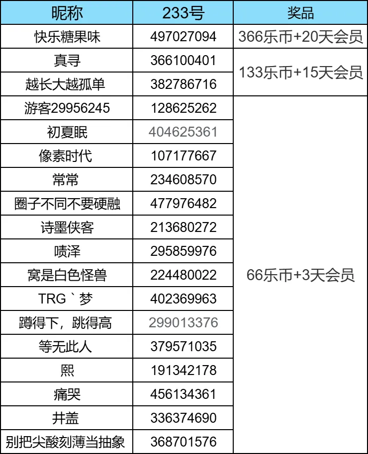 从正确参与的召唤师中,随机抽20位获得【233乐币+30天会员】