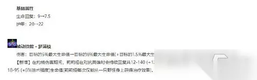 这里我们着重看莉莉娅的关键属性以及关键改动,属性方面莉莉娅的基础生命值回复降低,但是相对基础的护甲升高。而被动方面除了应该有的灼烧效果外,莉莉娅在伤害敌方英雄或者野怪时也能收益一定的回复,值得一提,伤害野怪只能从一只野怪身上获取治疗效果。