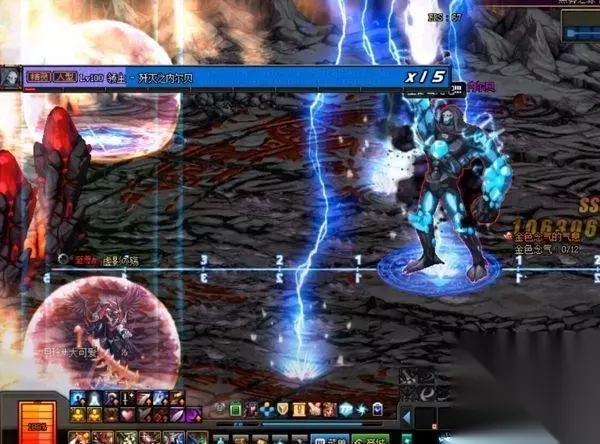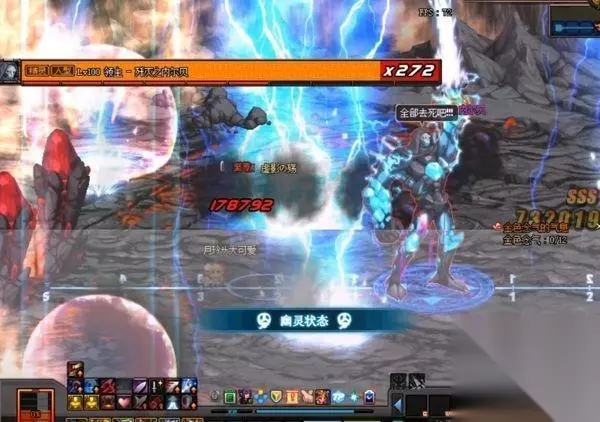 6.闪电风暴:内贝尔会瞬移到屏幕中间,随之会出现闪电击中眩晕玩家,然后发动闪电风暴技能,此技能是全屏范围,此时屏幕四个角落会出现4个小型念气罩,同时屏幕中下方也会出现一个读条,在读条结束之前没有进入到念气罩的玩家将会被雷电劈死,一个念气罩只能进入1人,2人以上念气罩则会消失导致两个人一起死