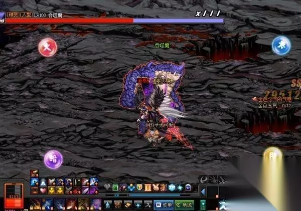 左上角——火,右上角——冰, 左下角——暗,右下角——光 可选择与自身相当于的最强属性来留下相对应的属性球让吞噬魔接触。当吞噬魔接触到一个属性球之后会喊:“疼疼疼。”