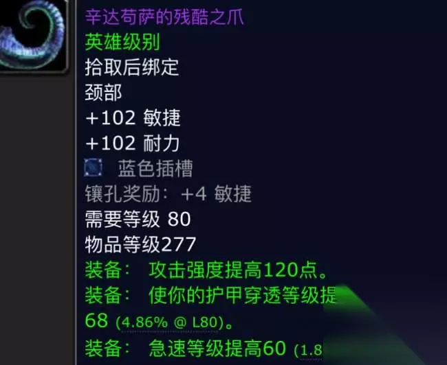 第七件:辛达苟萨的残酷之爪。这是一件急速流的物理项链,也是超级品的神级装备,它的白字属性是102点杵到顶的敏捷和耐力,一个蓝色宝石孔的加持,绿字属性则是120点攻强和68点的护甲穿透以及60点的急速,和它对应的是第五件的那个项链,一个暴击一个急速两个流派的,但是这一件项链是版本毕业级别的。