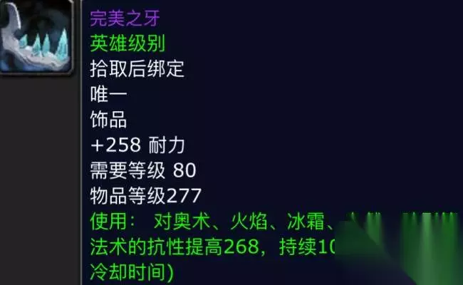 冰冠堡垒中的冰霜巨龙辛达苟萨,是一只被巫妖王复活的强大冰霜巨龙,生前是玛里苟斯的配偶,另一版翻译名为辛德拉苟萨,可以说这个BOSS的难度挺大的,当年在冰龙开荒时期,那可真是灭的死去活来,那么这么强力BOSS会掉落哪些极品装备呢,本期小鹿就来带小伙伴们一起来看看。 第一件:完美之牙。这是一件非常特殊的饰品,它的属性有着高达258的耐力,以及使用后可以获得268点抗性,持续10秒,并且只有一分钟的冷却时间,268点的抗性在英雄难度的冰龙和巫妖王的BOSS战中有奇效。当然这件饰品最大的用处就是PVP,因为它只有60秒的CD时间,加268全部抗性10秒,对上法刀,相当于一分钟一个无敌,效果美滋滋,在当年被称为十大神级饰品。