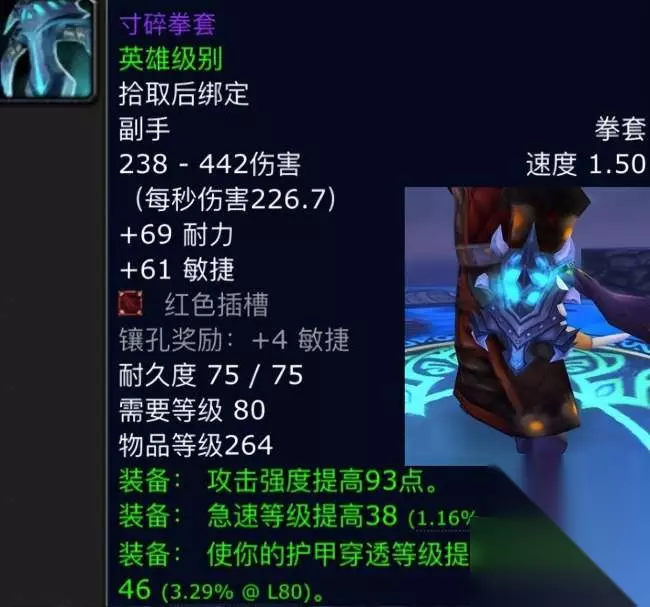 第四件:寸碎拳套。拳套这种类的武器自TBC凤凰拳套以后,一直都是一个冷门武器。我们先来看看这个拳套的属性吧,它有着1.5的攻速配合着226.7的秒伤,小鹿觉得副手的这个攻速真心不错,秒伤也是及格,白字属性则是中规中矩的69点耐力和61点敏捷,一个非常不错的红色宝石孔,绿字属性则是近战的三个主流属性,93点攻强和38点急速以及46点护甲穿透,可以说这个拳套你找不出一丁点废属性,那么有哪个老玩家知道,这件副手拳套配哪个主手呢。