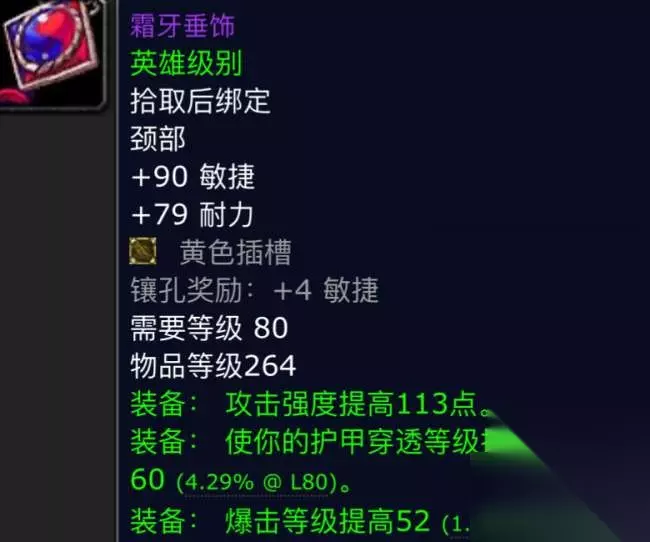 第五件:霜牙坠饰。这是一件超极品的物理项链,小伙伴们要是不信,我们可以看看它的一个属性,它的白字属性给到了一个90点在264装等中杵到顶的敏捷,而耐力只有79点,这在这个版本中是很少见的,一般情况下只有法系装备是这个样子的,并且还有一个黄色宝石孔加持,在绿字方面更是不的了,加了113点攻强和60点的护甲穿透以及62点的暴击,像这种没有任何废属性的装备,哪个物理职业不想要,除非你是急速流。