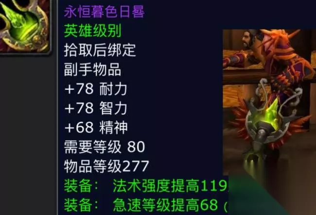 第六件:永恒暮色日晷。晷这个字有多少人读了出来,小鹿查了字典才用拼音拼出来的。这是一件治疗和急速流法系DPS的副手装备,我们来看看它的属性,白字方面是三系开花,加了69点的耐力和智力以及60点精神,在三系白字中,这个数值已经不错了,绿字属性则是106点法强和60点急速,整体上属性非常的均衡。