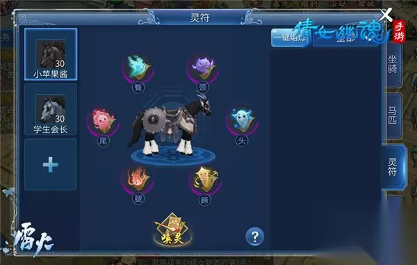 同时,马匹本身拥有词条属性,并可以通过【守护系统】可以将马匹的属性加成到灵兽身上,帮助玩家增强战力。马匹的装备是对应马的六个身体部位的符灵,而玩家可以通过唤灵系统召唤出附身于符纸中的神灵。