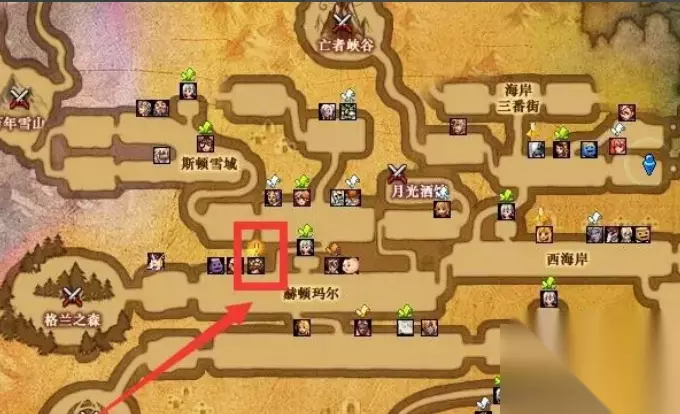 4、打开小地图,沿着标记前往赫顿玛尔大街左侧