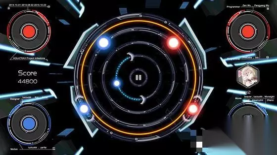 PURE MODE操作模式 而DUAL MODE模式下,虽然节奏点都会出现在中圈内这点看似比前者稍微简单一些,但节奏点的颜色则会分为红蓝两色,玩家需要通过控制外圈两红亮蓝的按键来点击对应的颜色。在该模式下如果节奏点速度够慢也还好,但如果速度一旦提起来难度则要比PURE MODE模式更有难度。