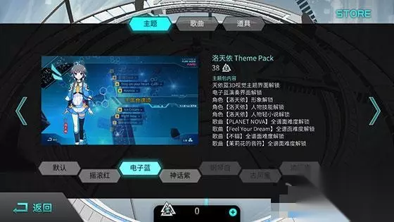 游戏中收录众多经典的粉丝向歌曲 是“天依蓝”更是种主题 为了更好的在游戏中展示洛天依等人的形象,所以在《Zion载音》中特意将它们做成不同颜色的背景主题,其中有一直以来代表洛天依的蓝色,在该作中则变为了充满科技感的电子蓝,除此以外还有蕾蒂西亚所代表的神话紫以及Echoplex代表的摇滚红等等。然而这些不同颜色的主题除了在进行游戏时体现不一样的背景质感外,每当解锁其中任意一个人物都会相对应开启该人物的技能以及轻小说和歌曲,如此做不仅可以让人更加了解他们每个人的人物背景,更能在弹奏乐曲时起到一定的辅助作用。