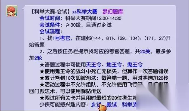科举制度介绍: 1、每月一次,时间为每月第二个星期日12:00-17:00,无需报名。 2、御前科举分为乡试、会试、殿试三个阶段,参加会试并且成绩优秀的玩家会获得殿试资格。 科举具体时间: 1、乡试 (1)每月第二周周日12:00-14:30; (2)等级≥10级 (3)—共40题,且每人只有1次机会,答对≥30题可继续参加会试。 2、会试 (1)每月第二周周日12:00-14:30; (2)等级≥30级且通过乡试; (3)累计答错10次即被淘汰,每轮20关,共2轮。 3、殿试 (1)每月第二周周日16:30-17:00; (2)会试用时最短的前20名; (3)—累计答错5题即被淘汰。