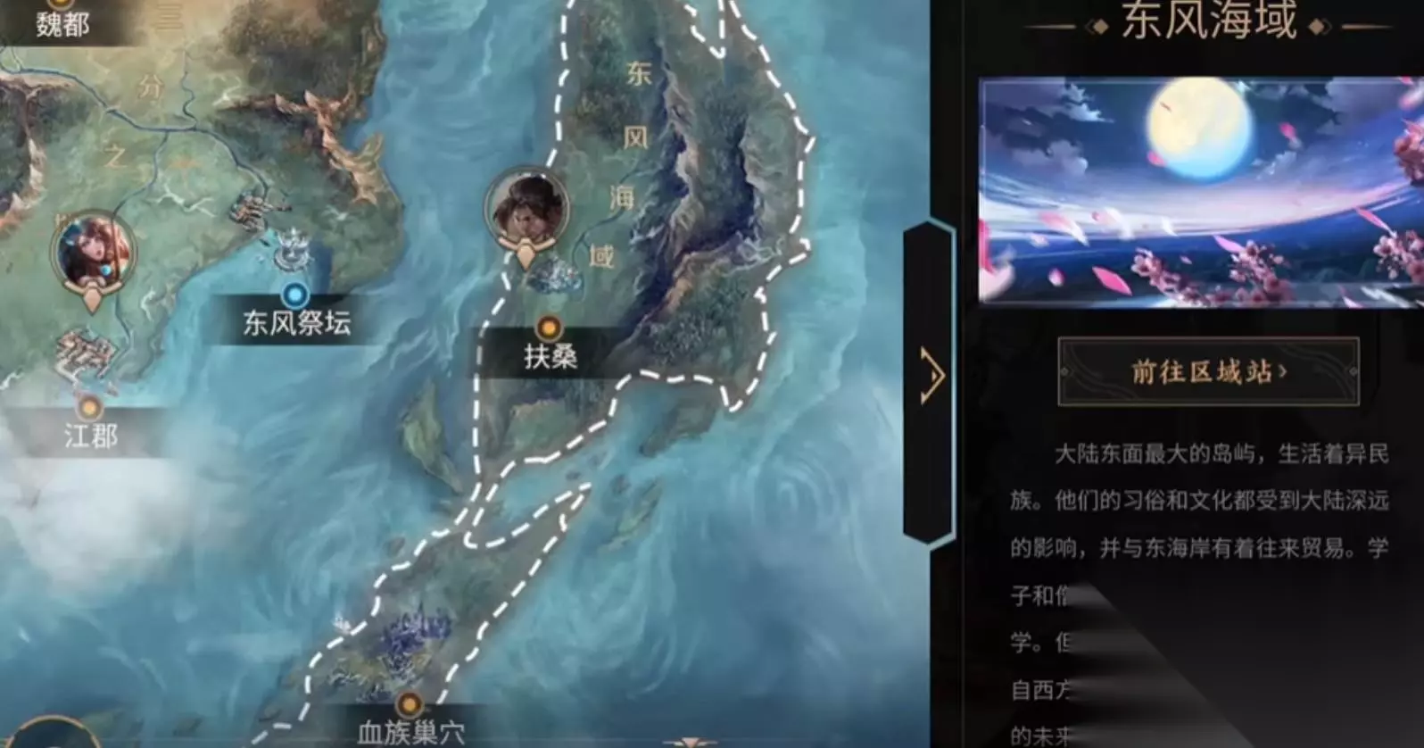 王者大陆东部地区由三分之地和东风海域组成。三分之地不但是玩家的起点,也是新手村,它以三国文化为背景,孙策、孙尚香、吕布等英雄的任务遍布其中。向东延伸就是充满东方武士风的东风海域,宫本武藏等人活跃于此;继续往北去,就会到达神秘的建木地区,那里连接着神魔主题,是盘古、女娲等神话系英雄的汇聚之处,带有浓厚的上古传说色彩。