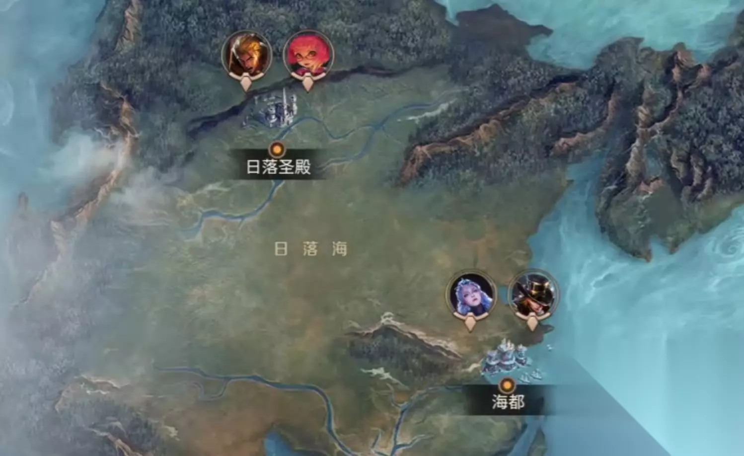 西部地区则有着完全不一样的面貌,日落海在地图的左上角,以西方奇幻风格为主,其海洋城邦和日落圣殿附近经常出现杨戬和鬼谷子等角色。除龙脊骨、沧浪楼船、和柱墟等以外,西部还有很多奇特的地形地貌。高难度的挑战区是环境恶劣或者敌人势力强大之处,必须由两个玩家以上一同闯入,方能解开隐藏的剧情和获取高级奖励。
