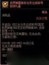 开启后,可以从任务达成称号[翡翠机甲御者]和[苍空机甲御者]中,选择获得一个。获得的称号没有属性,无法合成、分解和交易。