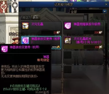 NPC达芙妮商店中的神兽神器装扮变更券也被替换为机甲神器装扮变更券。