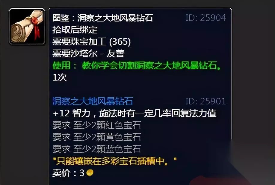 图鉴:洞察之大地风暴钻石,治疗用的多彩宝石,图纸属于比较好弄的一个,只需要沙塔尔声望达到友善之后就可以,我们在满级之后,刷刷天空三本,很快沙塔尔声望就可以达到友善。