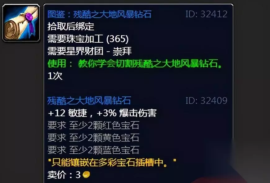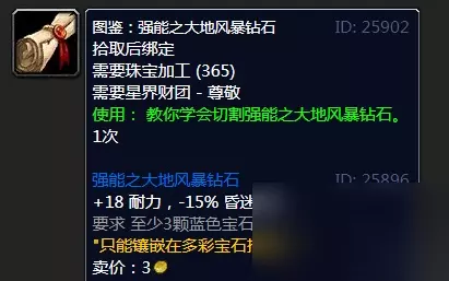 图鉴:残酷之大地风暴钻石,物理输出毕业的多彩宝石,前期后期都需要用到这个宝石,学会了这张图纸,到时候可以站街帮人切宝石收点加工费,也可以制作成品放到拍卖行卖。图纸需要星界财团声望崇拜后购买,所以在前期,我们记得多刷点星界财团的声望。