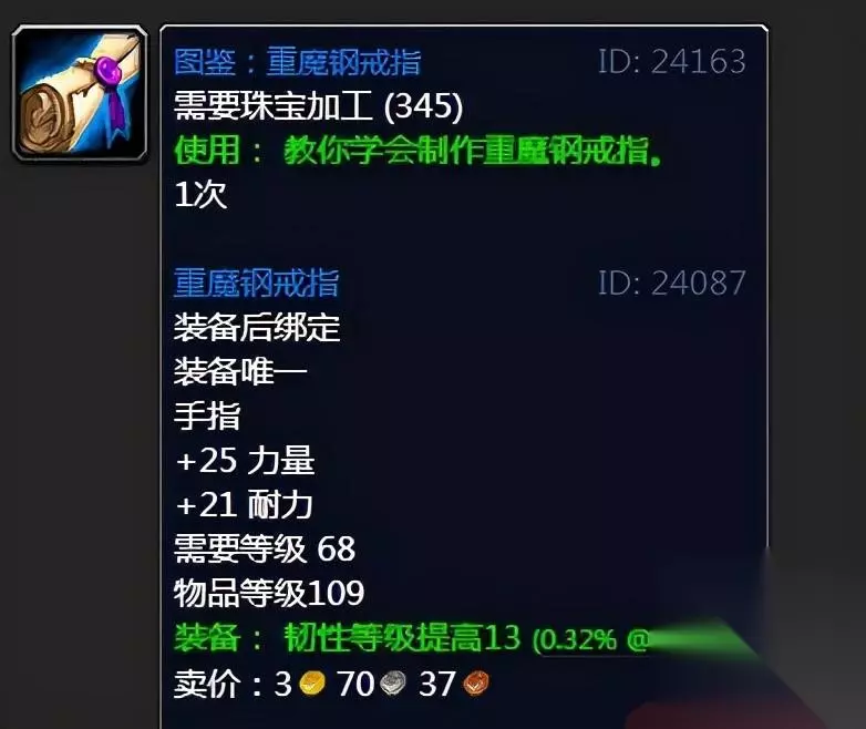 图鉴:重魔钢戒指,前期不错的物理戒指,而且自带韧性,还可以用来打pvp。那么图纸的掉率是比较低的,单刷的话监狱去刀锋山刷拉什风行者,有千分之四的几率出,而且这个图纸用来冲珠宝加工技能也是非常不错的。